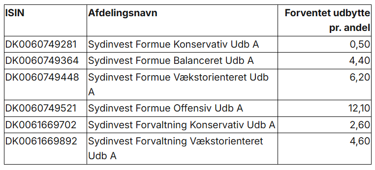 Vi forventer, at udbyttet går ind på investorernes konti den 6. februar 2025. Den sidste handelsdag for andele inkl. de foreløbige udbytter er den 3. februar 2025. Første handelsdag, hvor de foreløbige udbytter er fragået i kursen på andelene, er den 4. februar 2025. Der vil blive tilbageholdt udbytteskat i samtlige aktiebaserede afdelinger.